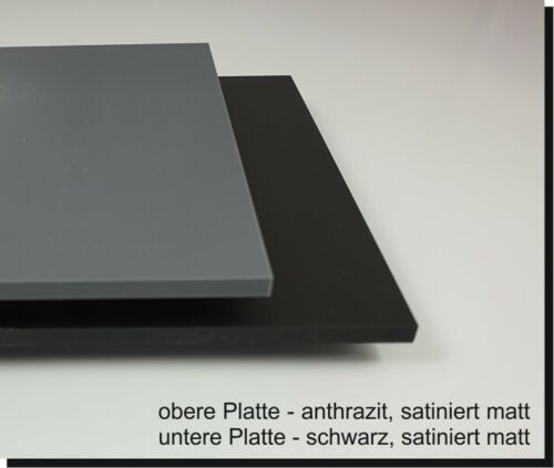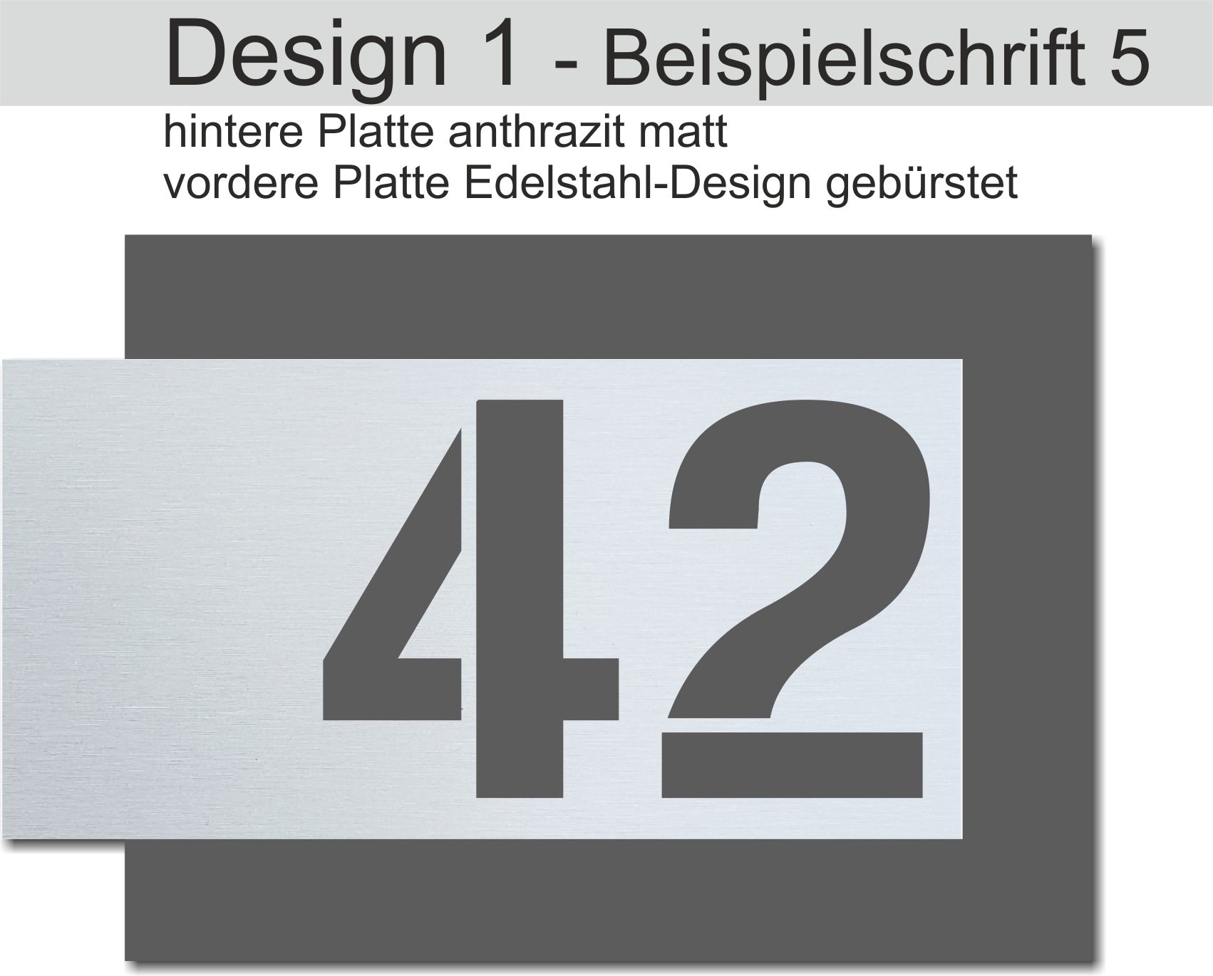 Alle Schilder bestehen aus 2 fertig montierten Platten. Zur Auswahl stehen Kombinationen aus einer Verbundplatte im Edelstahl-Design und/oder matt satiniertem Acrylglas - wahlweise in schwarz oder anthrazit.